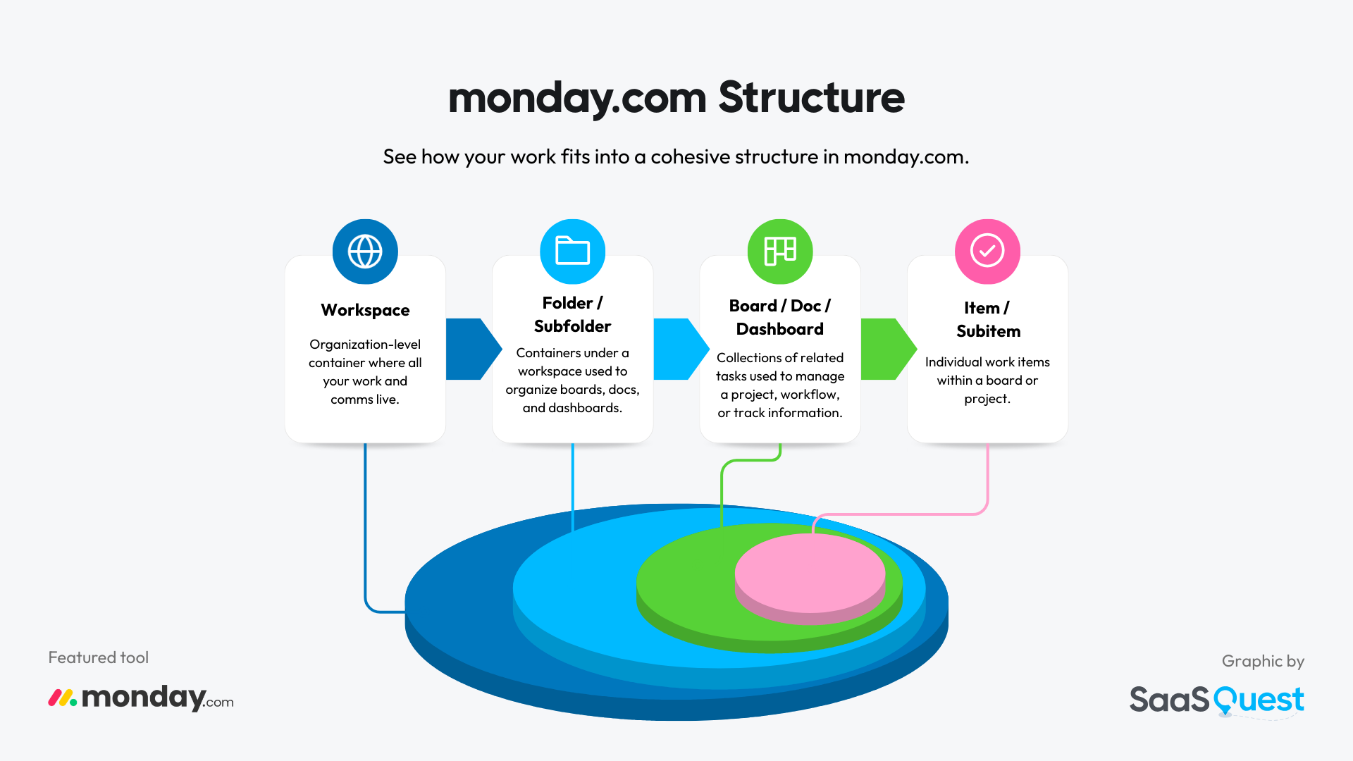 monday.com organizes work into Workspaces, folders, and boards, with boards containing items and subitems (e.g., tasks, deals, requests) that you track with columns such as status, people, dates, numbers, and formulas. You can switch between views like Table, Kanban, Gantt, Calendar, and Dashboards so the same underlying data appears in the format that best supports planning, execution, or reporting. This structure lets you keep detailed, row‑level work visible while still rolling up progress across multiple boards into portfolio‑style dashboards tied to goals and KPIs.